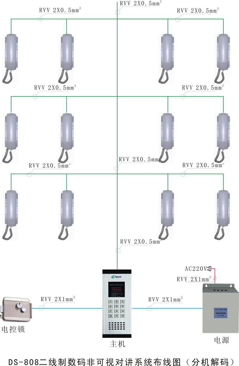 • DS-808二線制數碼非可視對講系統布線圖(分機解碼)
